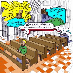 No soy un entusiasta de las viñetas del Eloi Arán, pues su tono naïf no me parece que concuerde con el espíritu de quienes regresan con vida de la muerte, sino con el de quienes aspiran a ser buenos chicos, pero aquí, sin duda, la clava… El texto: Lc 18 9-14. Probablemente, aun no hemos caído en la cuenta de lo escandaloso que resulta para la típica conciencia religiosa que alguien diga, en nombre de Dios, que el cabrón que invoca a Dios cubierto de su propia impotencia para vivir conforme al mandato de Dios se encuentre más cerca de Dios que, precisamente, quienes son conscientes de llevar una vida elevada.